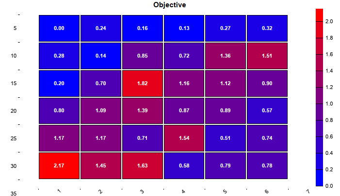 The x axis is the number of WFO cycles, the y axis is the OOS period in percent. The numbers in the fields are the resulting strategy performance, selected by _Criteria. You want as much red in the heatmap as possible. The above example, with the Pessimistic Return Ratio (PRR) as metric, has only 13 red fields out of 25. This job would not pass the CA analysis.