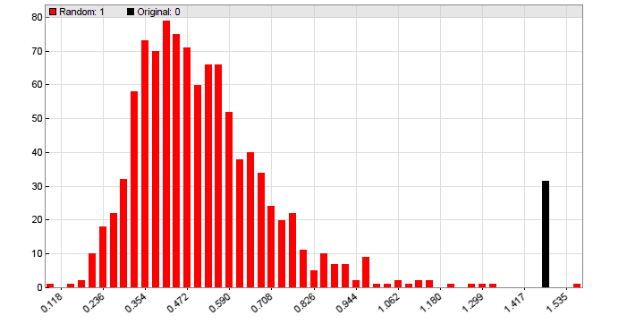 Montecarlo Analysis is normally only applied to the final strategy with all assets and algorithms. It generates a histogram from results with randomized price curves (red) and the original price curve (black). This one below indicates that you better don't trade that system live, since its great walk-forward performance is not to trust: