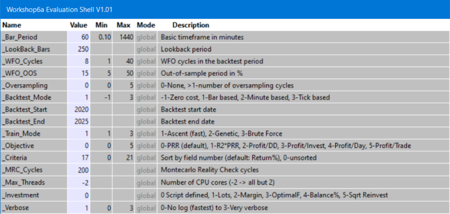 You can attach the shell to an existing script in several ways. For the full process it must take control over all variables and replace its asset/algo loops But for adding cluster analysis, Montecarlo analysis, oversampling, various walk-forward optimization methods, and different training objectives, you only need to insert two lines. Include eval.h at the begin of the script: