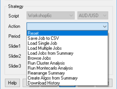 Create Algos from Summary Select a summary generated by previous training. All profitable and robust jobs from that summary with a CA result of 75% or better are automatically selected for the final portfolio. Their variables, assets, algos, and time frames are stored in Data\*_algo.bin. This file is automatically loaded at start. Training, testing, and trading will now use the full porfolio. To discard it, use Reset.