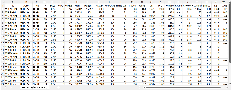 The next step is an automated process that runs through all jobs, trains and tests any of them with different asset, algo, and time frame combinations, and stores their results in a summary. The summary is a CSV list with the main performance parameters of all jobs. It is sorted by performance: The best performing jobs are at the top. So you can see at a glance which parameter combinations work with which assets and time frames, and which are not worth to examine further. You can repeat this step with different global settings, such as bar period or optimization method, and generate multiple summaries in this way.