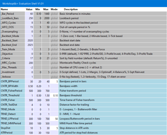 The shell evaluates parameter combinations by these criteria. The robustness under different market situations is determined through the R2 coefficient, the parameter range robustness with a WFO profile (aka Cluster Analysis), the price fluctuation robustness with oversampling. A Montecarlo analysis finds out whether the strategy is based on a real market inefficiency. More about WFO profiles and Montecarlo analysis can be found on financial-hacker.com/why-90-of-backtests-fail, more about oversampling on financial-hacker.com/better-tests-with-oversampling.